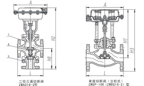 切斷閥采用多彈簧執行機構與調節機構用三根立柱相連,整個高度可減小約30%,重量可減輕約30%。