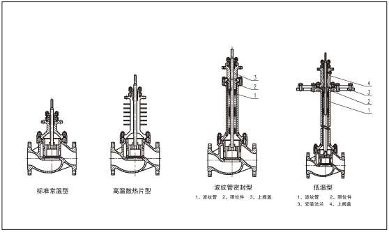 系列類型常溫型、中溫型、低溫型。波紋管密封型、夾套保溫型、調節切斷型